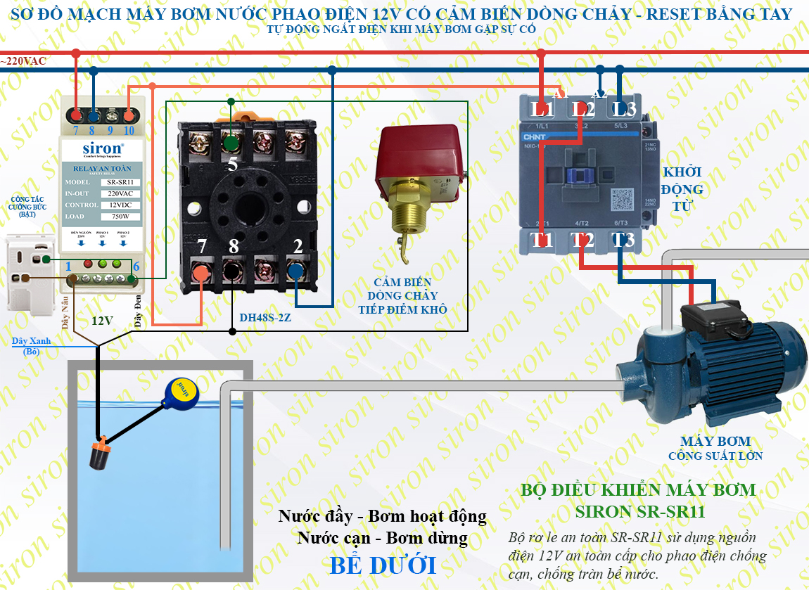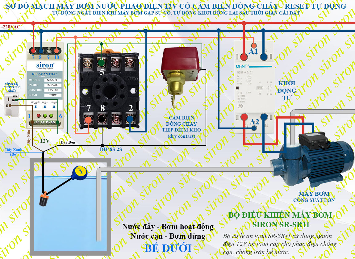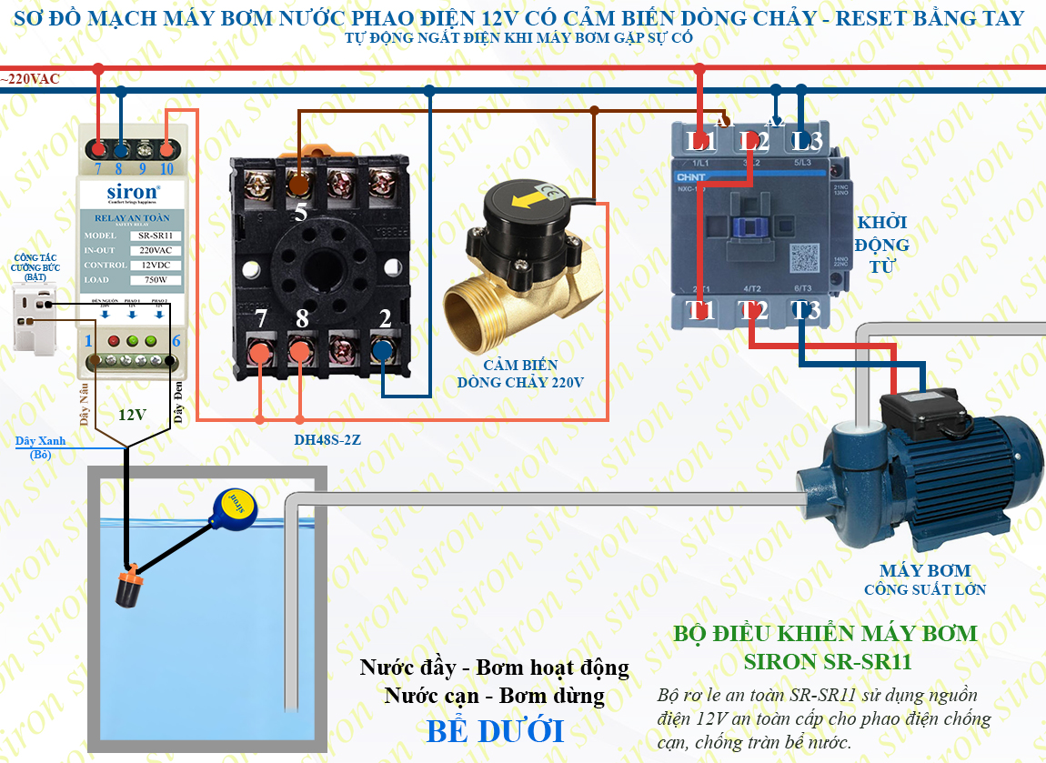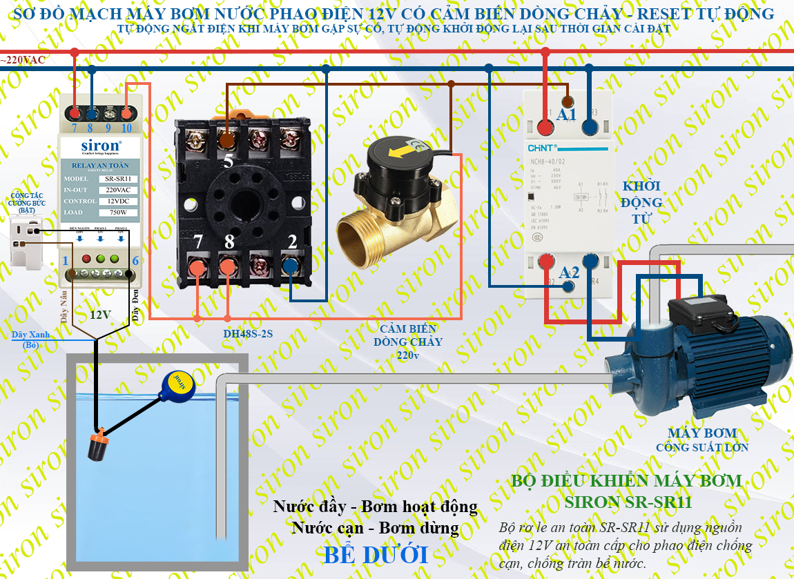 Sơ đồ lắp máy bơm nước 1 pha công suất lớn, có cảm biến dòng chảy 220v tự động reset khi có lỗi, dùng khởi động từ 1 pha